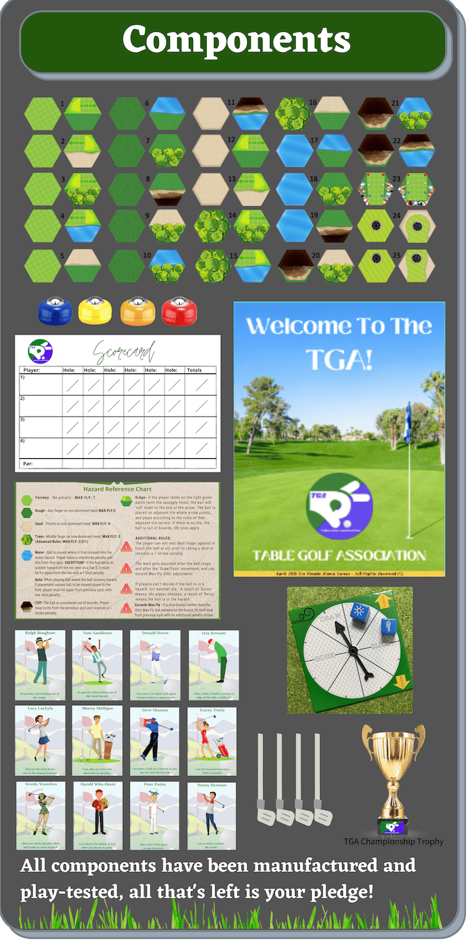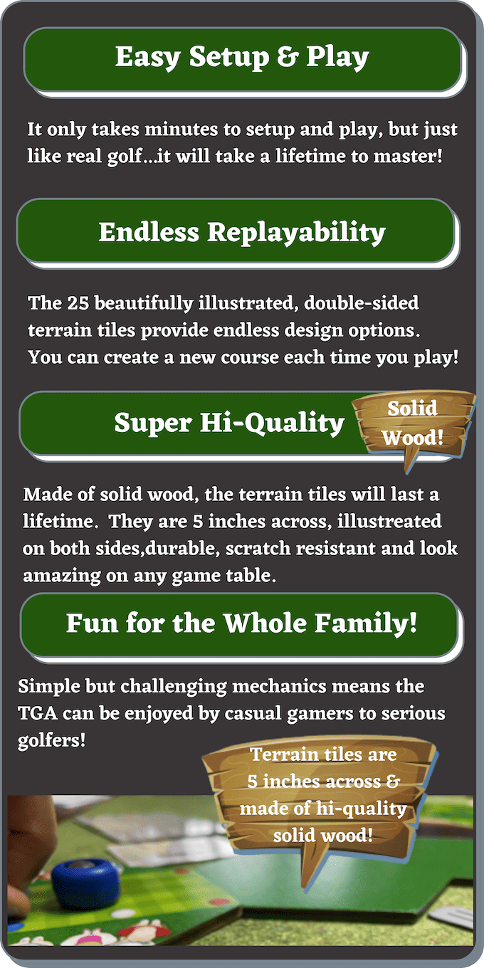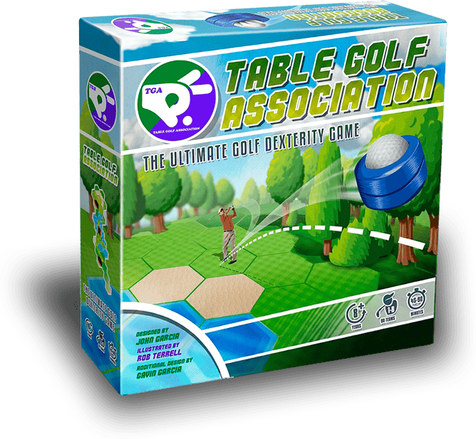 The TGA is a first of its kind dexterity game that replicates the game of golf. Rather than the usual dice and card driven mechanics of other golf games, the TGA is a game of skill that makes you feel like you're playing golf.