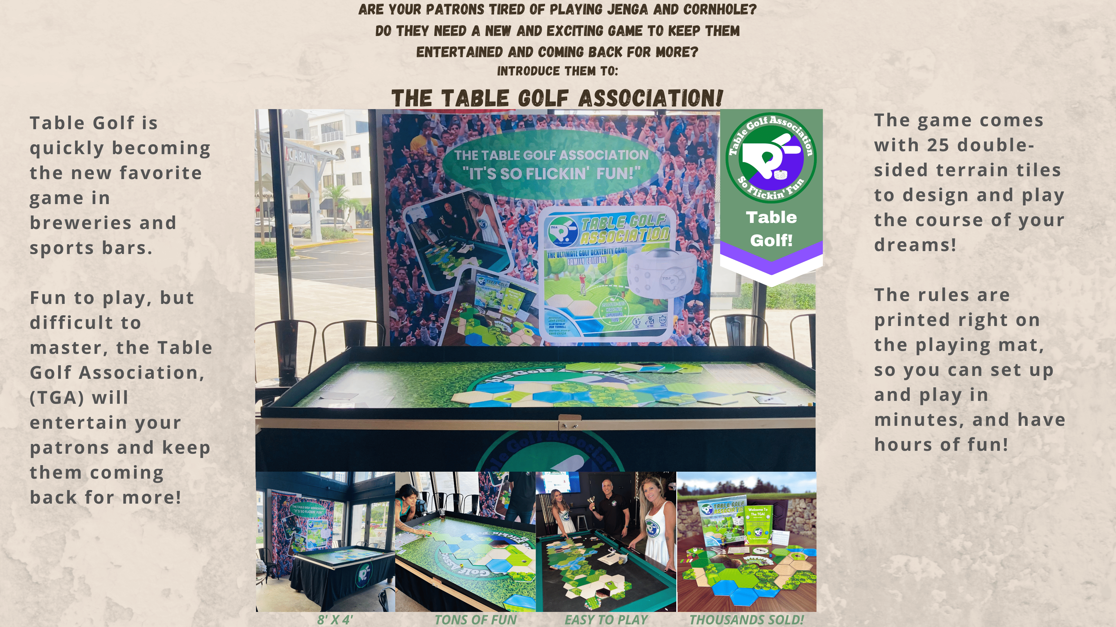In addition, the league will be supported with advertising, merchandise, and other prizes. It will be a great way to drive traffic to your brewery and if you Fill out the form, or email tablegolfassociation@gmail.com so that one of our reps can contact you and schedule a free demo so you can order the game.