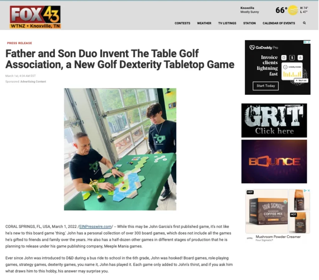 For Immediate Release July 13th, 2022 Coral Springs, FL Father and Son duo invent The Table Golf Association, a new golf dexterity tabletop game. First time father and son game