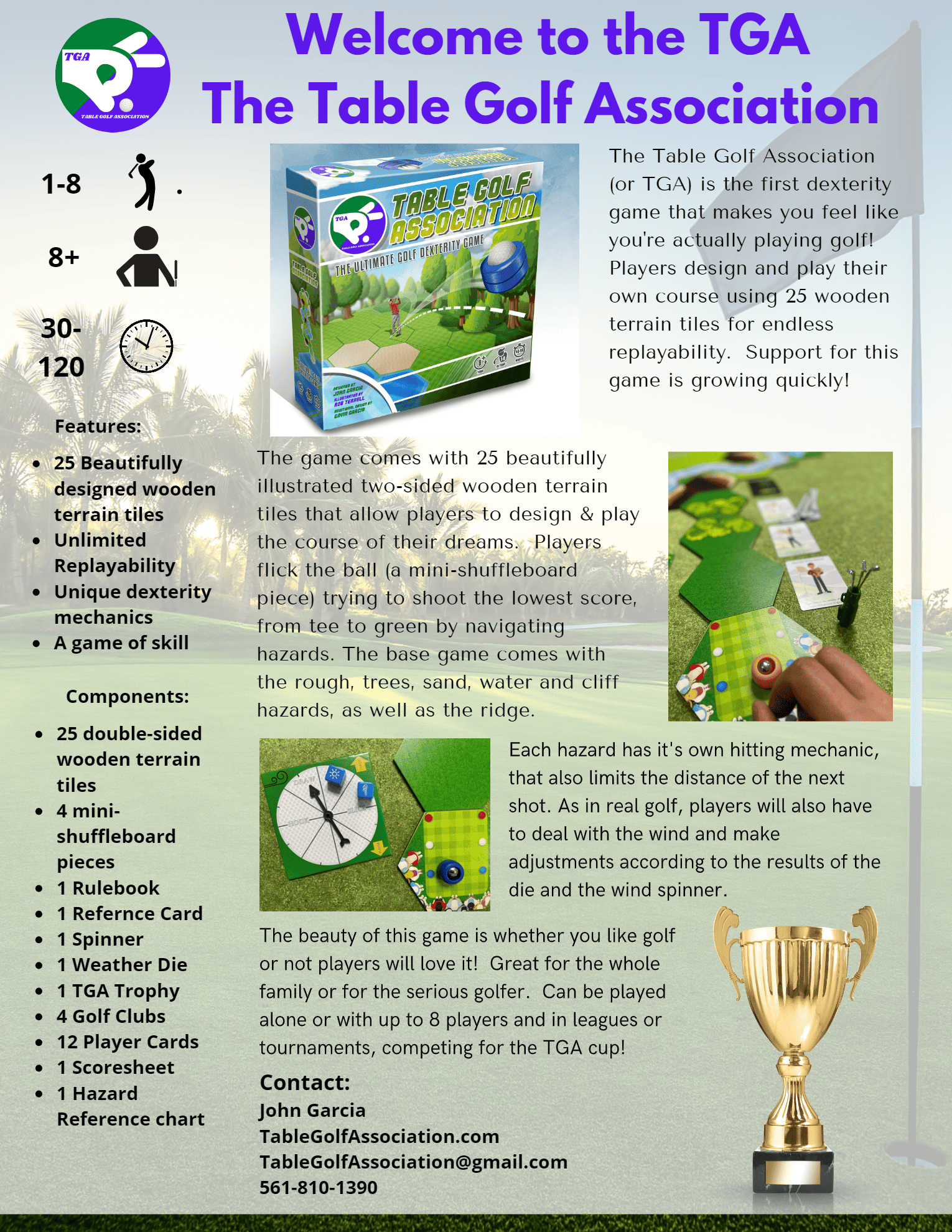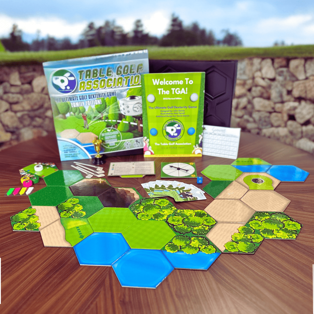 The Table Golf Association is a first of its kind golf dexterity game. Using 25, double-sided wooden terrain tiles players design and play their own golf course. Players flick a unique slider from tee-box to green trying to avoid the hazards and score the hole in the least shots possible.